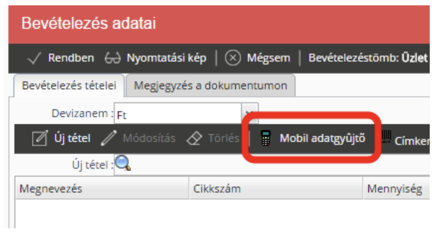 - Az InnVoice online rendszerben például a Bevételezések, vagy Leltár korrekciók menüben nyissunk egy Új bevételezést, majd ott kattintsunk a Mobil adatgyűjtő gombra.