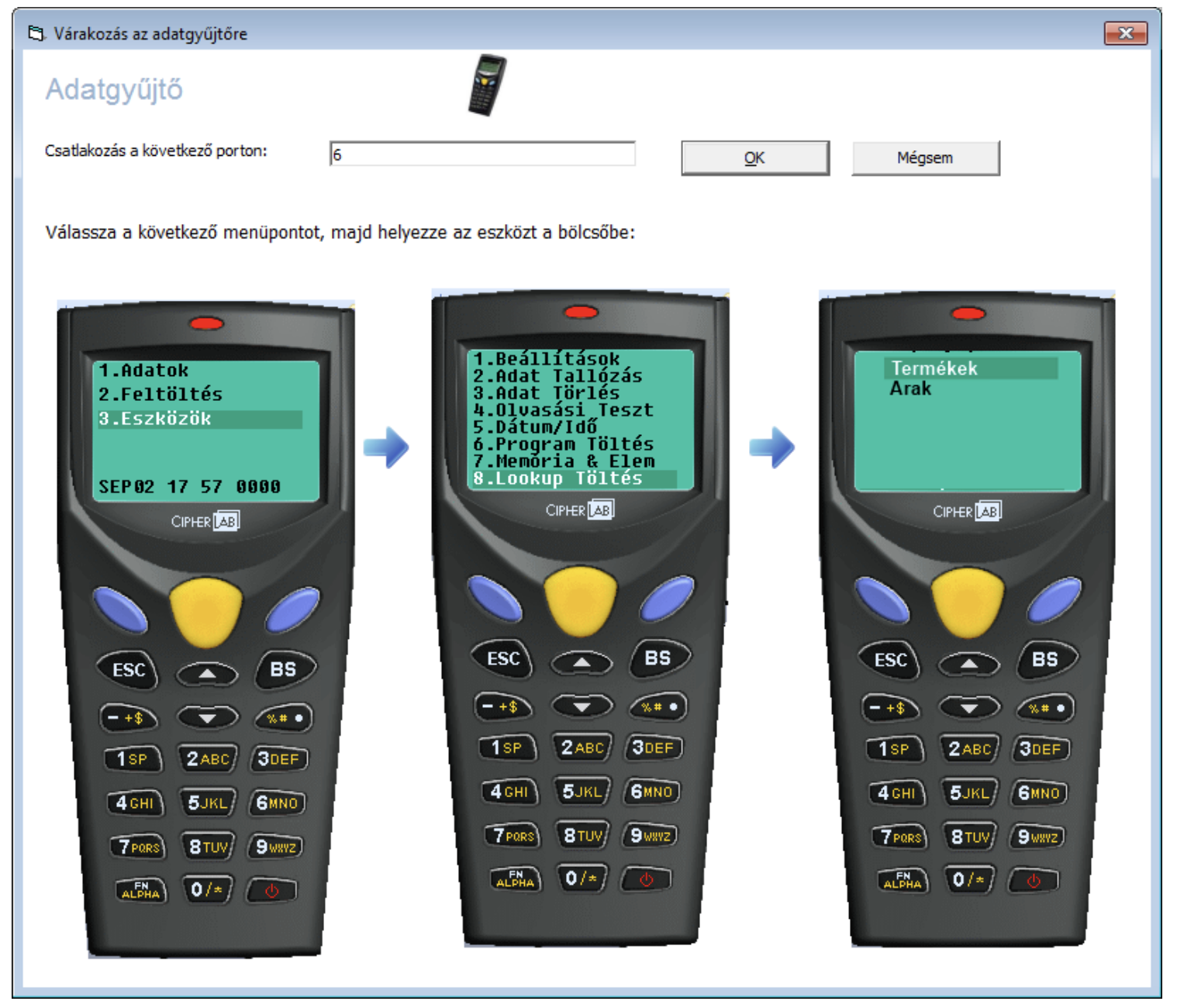 4. Kövessük az eszközkezelő lépéseit, azaz a 3. Eszközök / 6. Lookup töltés / Termékek menüpontot válasszuk és itt az ablakban a „Csatlakozás a következő porton” mezőben a port számát adjuk meg (ha nem tudjuk, akkor az 1.1.1 pontban tudjuk kideríteni):