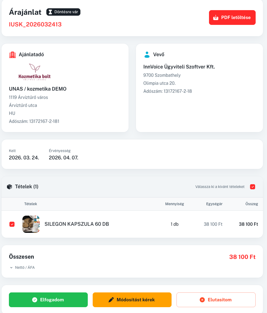 Itt lehetősége van az ajánlatot PDF formátumban letölteni, vagy Elfogadni, Elutasítani, esetleg Módosítást kérni az ajánlatról: