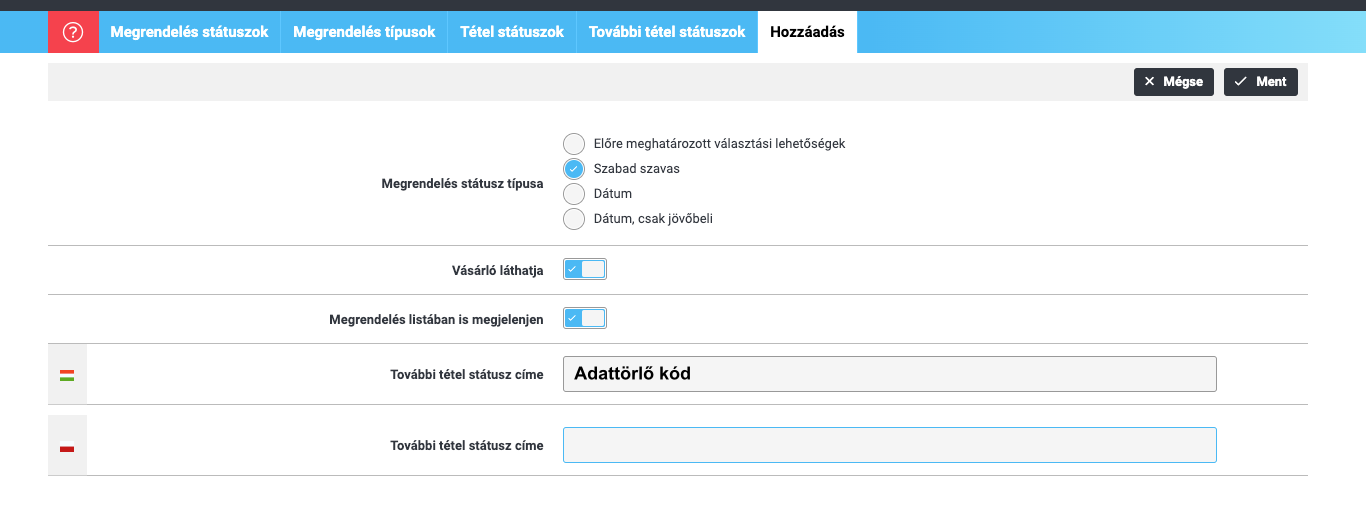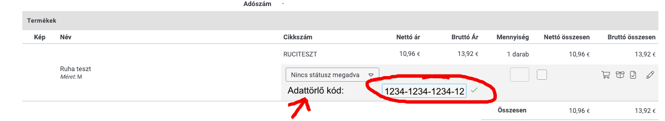 Miután az előző pontban leírtak szerint felvittük a tétel státuszt, a megrendelés adatlapján a tételek alatt megtaláljuk az Adattörlő kód mezőt. Ha nem találjuk az Adattörlő kód mezőt, ellenőrizzük a "Vásárló is láthatja" és a "Megrendelés listában is megjelenjen" jelölőnégyzeteket a státusz adatlapján, mert vélhetően azt pontatlanul töltöttük ki, nem a kép szerint.