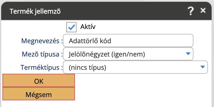 1. lépés: Az Innvoiceban létrehozunk egy "Adattörlő kód" elnevezésű, jelölőnégyzet (igen-nem) típusú termék jellemzőt, ami minden terméknél azt fogja jelölni, hogy szükséges-e adattörlő kód a termékhez, vagy sem. Ha az UNAS-t használjuk, akkor ne az Innvoiceban, hanem az UNAS-ban hozzuk létre a termék paramétert!