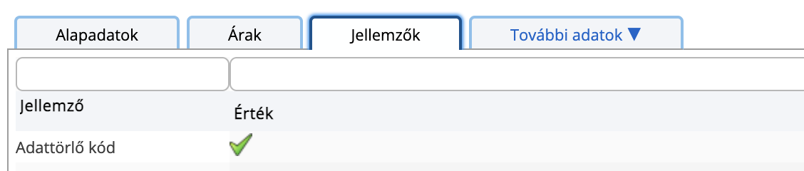 2. lépés: A termékek adatlapján töltsük fel ezt a mezőt, a "Jellemzők" fülön. Ezt a termék jellemzők excel importtal is feltölthetjük (1-est írjunk a mezőbe), vagy UNAS és egyéb webáruházból is automatikusan áttölthető (UNAS-ban a termék paraméter neve legyen "Adattörlő kód" és 0, vagy 1 értéket tartalmazzon).