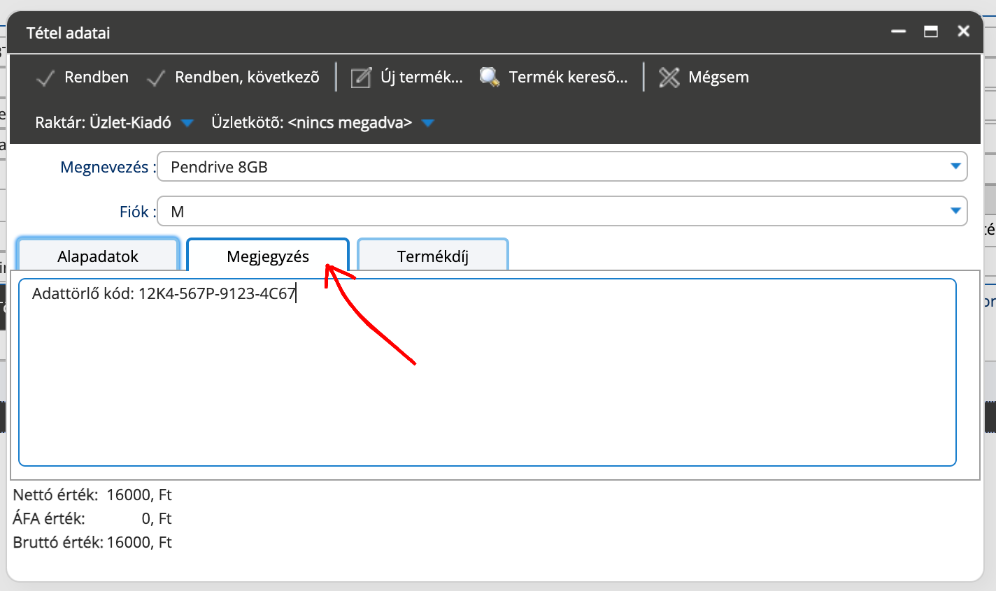 Fontos, csak a tétel megjegyzés mezőben adhatjuk meg!
